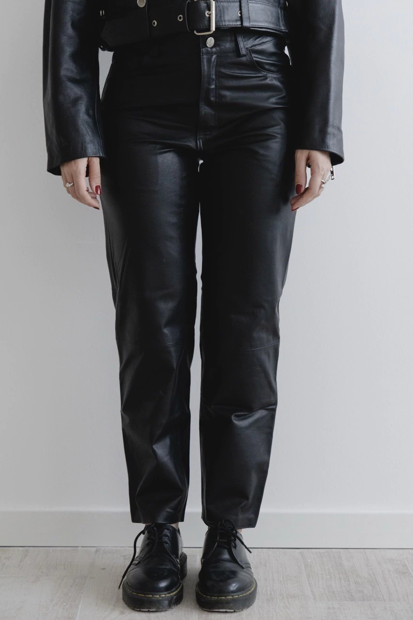 Pantalón de cuero negro de corte recto que redefine la elegancia con un toque contemporáneo. Su silueta impecable y acabado brillante lo convierten en una pieza clave para looks sofisticados y audaces.