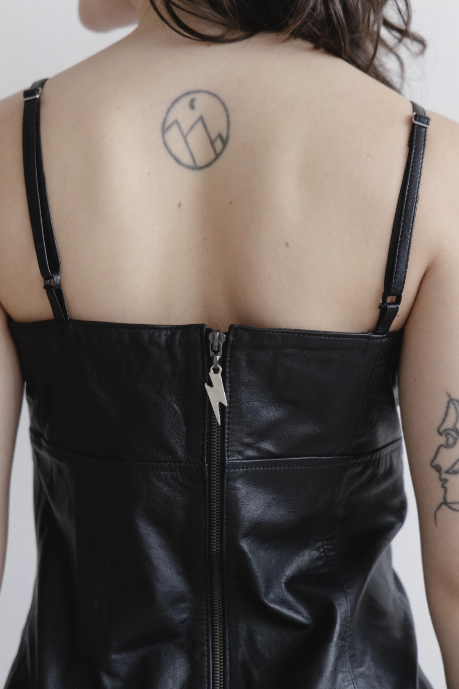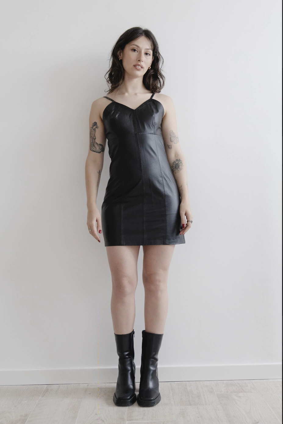 Este elegante vestido de cuero negro con silueta recta y su diseño minimalista, que resalta la figura con un toque sofisticado y moderno. Perfecto para ocasiones especiales o para elevar cualquier look nocturno.